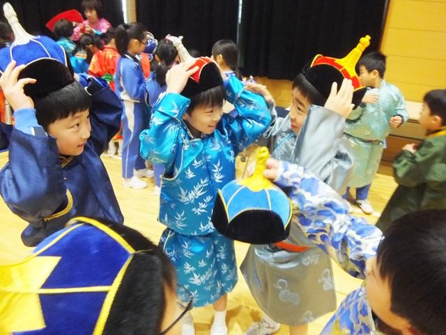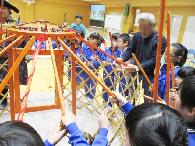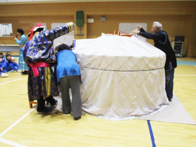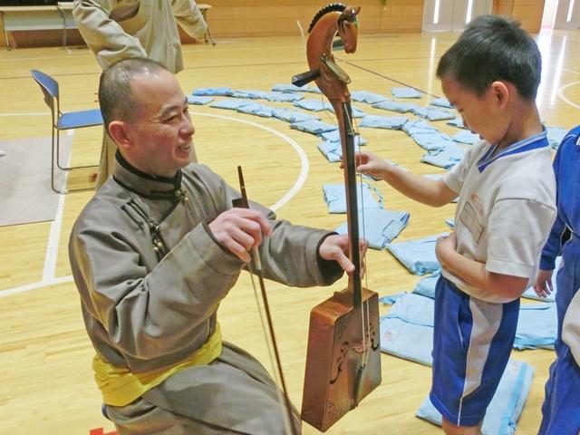 体験用のゲルは、4分の1の大きさということですが、小さな柱を組み立てるだけで釘を一本も使っていないということに、子どもたちは大変驚いていました。また、持ってきていただいた民族衣装のデールはとてもきれいで、鏡に映った自分の姿に「着物みたい。」と、笑顔を見せていました。さらに、民族楽器の「馬頭琴」を触らせてもらったり演奏を聴いたりすることもできました。目を閉じると、モンゴルの草原に立つ自分が想像できるような馬頭琴の響き渡る音に、子どもたちも聴き入っていました。