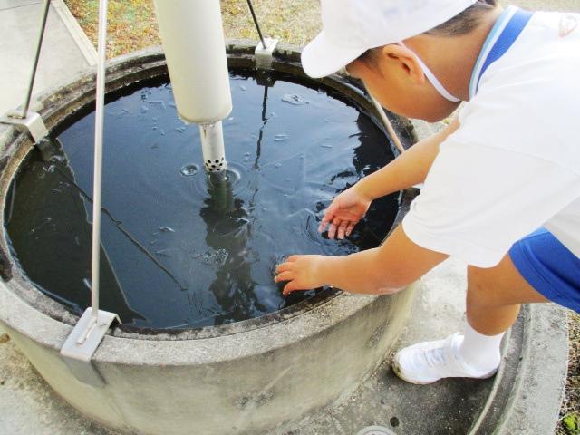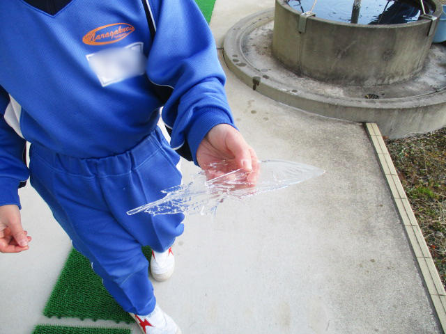 P(小学校1年~4年)棟の裏にある畑の近くは、風の通りがとてもよい場所で、校内でも氷がよくはる場所です。朝から「こんなに氷ができてた」「氷持ってたら手が真っ赤になっちゃった」と何人かの子どもが教えに来てくれました。「どこにできてたの?」と聞くと連れて行ってくれました。冷たくなった子どもの手を思わずさすって温めましたが、そんなことより見つけた氷をつかんで遊ぶのに夢中です。