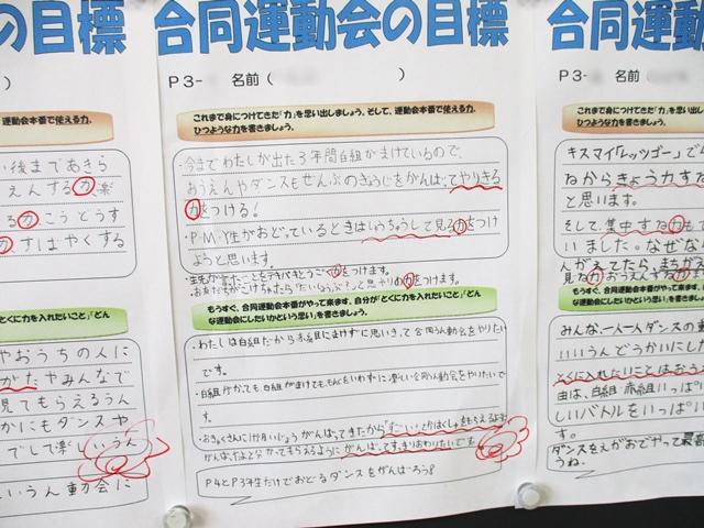 P3生の目標を少しのぞいてみました。「応援やダンスも全部の競技を頑張ってやりきる力をつける。PMY生が踊っているときは集中してみる力をつけようと思います。」「協力してがんばる力、みんなを思いやる力、みんなで力をあわせる力、最後までがんばる力をつけたいです。」というものです。