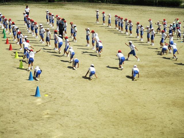 4限のPグラウンドではP3・4(小学3・4年)生が演技の「HEROES~ともに挑戦!」の練習中。2つの学年が演技をするときには、上の学年は下の学年のお手本となるように、下の学年は上の学年以上のできあがりを目指して練習していきます。四隅からの集合がどうやら最初のがんばりどころのようです。