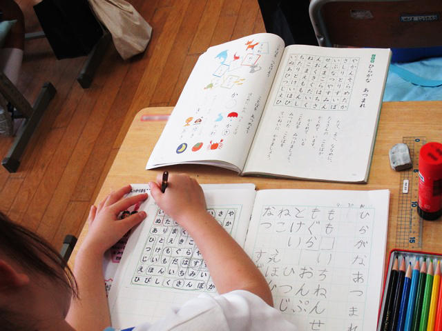 P1の教室をのぞくと、ちょうど「ひらがな あつまれ」の授業中でした。たくさんの「ことば」を集めて、ひらがなでノートに書きながら、友だちと一緒にことばを集める楽しさを一人一人の子どもたちが感じ取っていました。