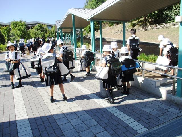 雲一つない青く澄み切った空の下、子どもたちが荷物をたくさん持って登校してきます。夏休みの作品や宿題が詰まったかばんです。どの子どもたちも元気そうに登校してくれて、まずは一安心。カーペットが新しくなったオープンスペースで、久しぶりの友だちとの時間を楽しんでくれていました。