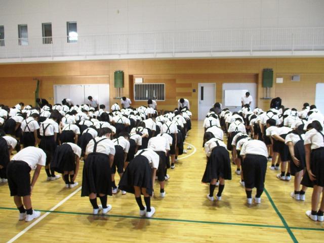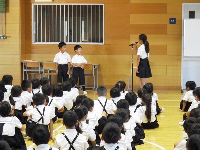 私の方からは、二学期にめあてとして持ってほしいことを二つ話しました。一つは、一学期に引き続き、あきらめない心で何事も粘り強くやりきる力をつけてほしい、ということ。もう一つは、校訓の「仁智」のもつ意味から話をしました。仁はいたわりや思いやる気持ち、智は善悪の判断という意味を持つ漢字でもあることから、思いやりを持って、一人ではできないことも、クラスや学年の違う考えを持つ友だちとも協力して学習や行事に向かっていってほしい、と伝えました。