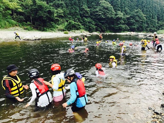 かやぶきの家見学、畑での収穫(とれたてのトマトやインゲンを食べたり、ブドウに袋かけをしたり…)、水遊び(ライフジャケットを身につけて川に浮かんで流れます…)、ラフティング体験、林業体験、キャンプファイヤー、なたで薪割り体験、火起こし・飯ごう炊飯。