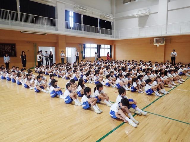 P体育館に集まる子どもたちは、ハンカチを口に当てて、あわてることなく整然と歩いて集合していました。集合にかかった時間は、4分30秒。整列後の話では、訓練は、将来自分が火災や災害に出会ってしまったとき、一人一人が自分の命を守るためにどうしたらよいか、判断して行動できるようになるために行っている、ということを話しました。