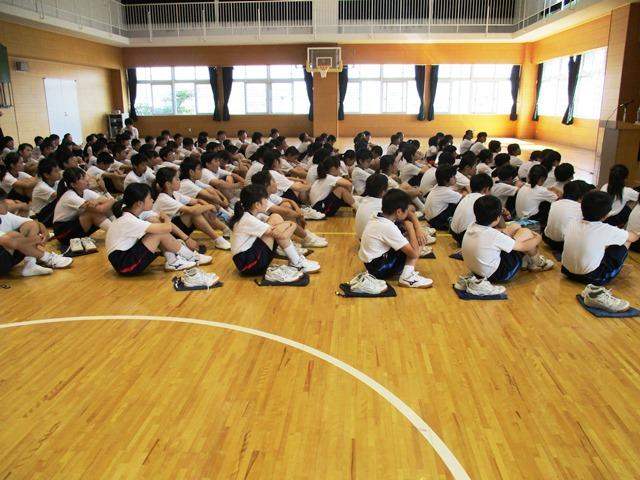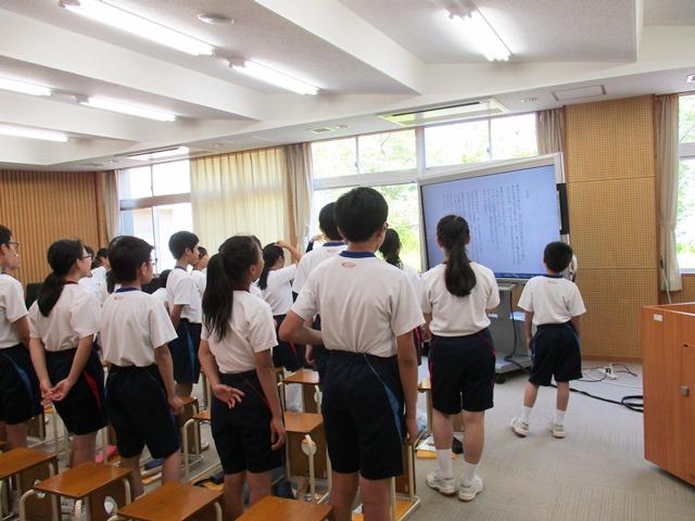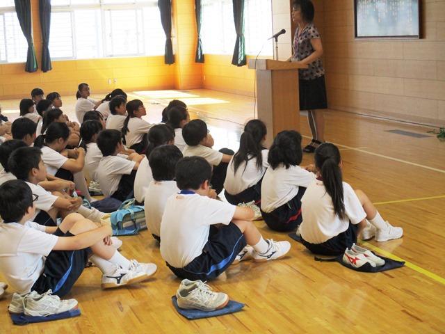 M1・2生(5・6年生)の朝礼がありました。朝礼では、できるだけ多くの先生が子どもたちに語りかけていくようにしています。今日は、音楽の末正先生からのお話でした。