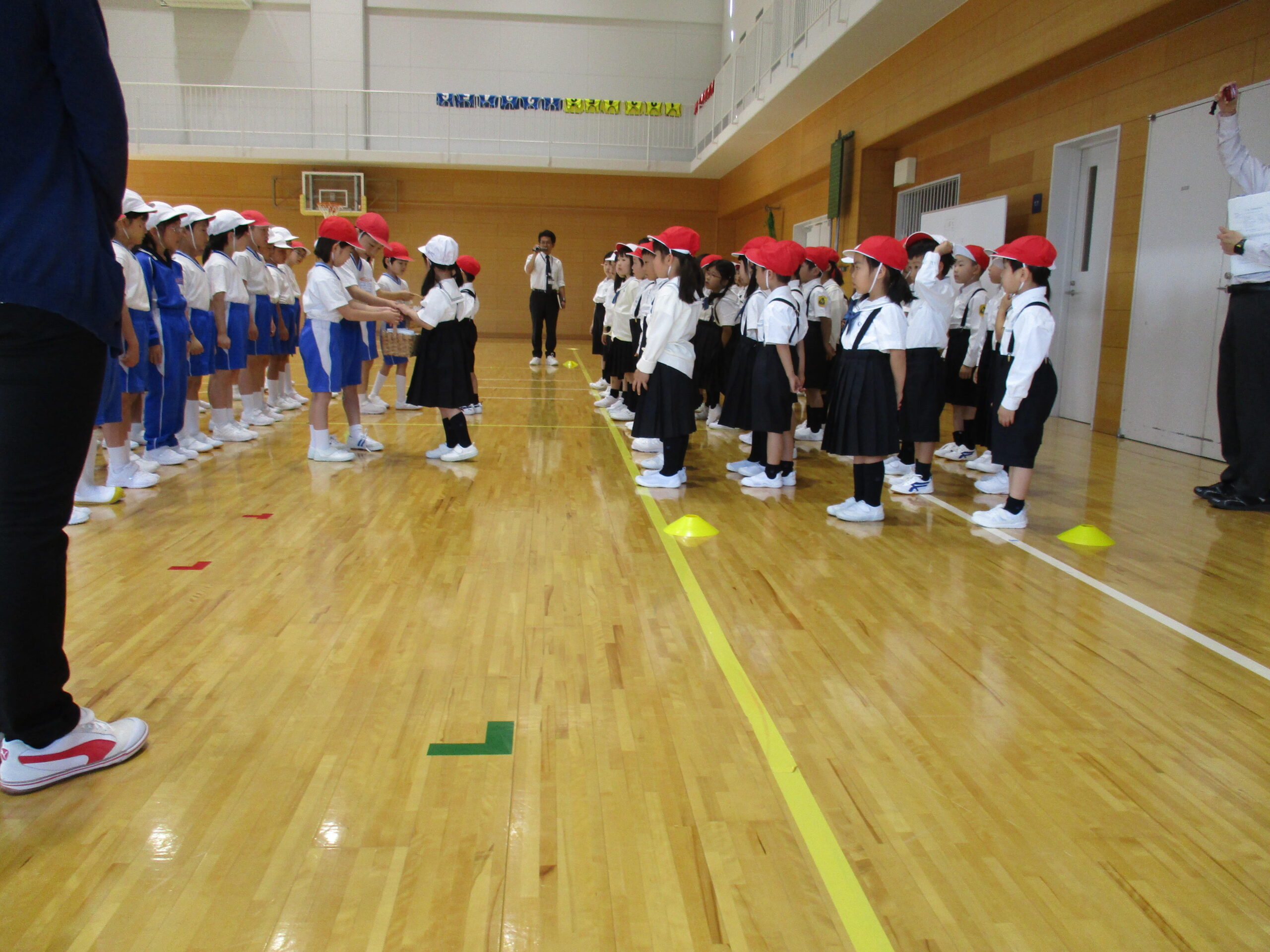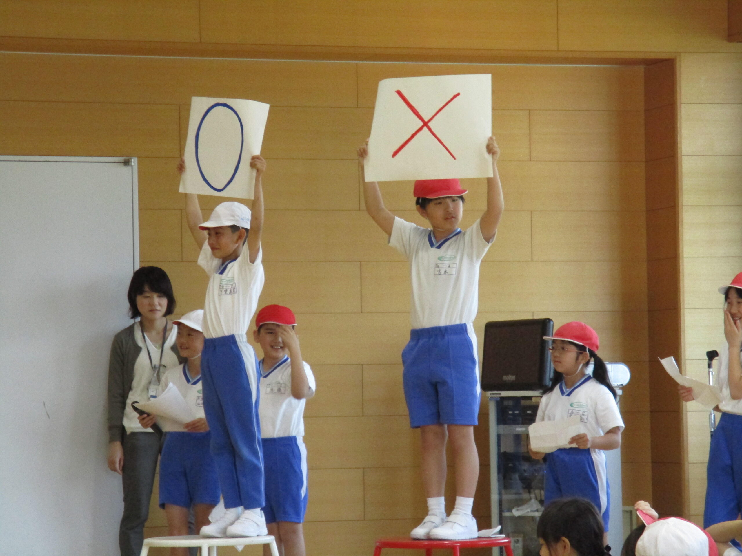 はじめのあいさつに続いて、まずは企画委員による○×クイズ。「奈良学園小学校にある保健室で騒いでもいいと思う人は帽子の色を白に、だめだと思う人は帽子の色を赤にしてください」という調子で続きます。続いてP2生はアサガオの種を、P3生はメダルのプレゼント。最後に「P生全員で楽しめたらいいと思います」と言ってP4生が歌ってくれたのは「友だちになろうよ」。手拍子も付けてくれたので、1年生も含めてほかの学年の子どもたちは、自然に手を打ちながら聞いてくれました。体育館がほんわかとした空気に包まれた気がしました。