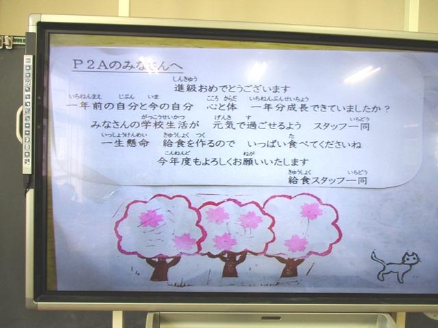 また、今日からP2~P4(小2~4)の給食も始まりました。スパゲティはどの子どもも好きな様子で、にこにこしながらいただく様子が見られました。給食調理員さんからのお手紙も届いていました。うれしそうな顔で「おいしい!」と言ってくれる子どもたちの姿を見ていると、作ってくださる方の気持ちも一緒においしさに加わって培われた心の絆により、子どもは心を安定させていくのだなと、改めて「食育」の大切さを感じた時間でもありました。