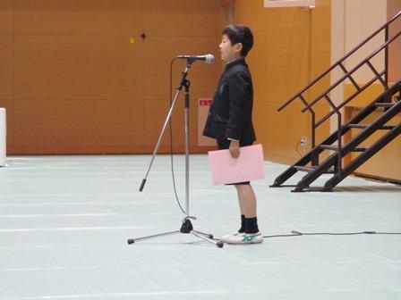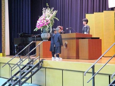 新入生を代表して、石井俊丞君と奥西結月さんが「たくさんのお友達を作っていっぱい遊んでいっぱい勉強します。みんなでなかよくがんばります。」と誓いの言葉を述べ、在校生を代表してP4年生の川口慶太君がお迎えの言葉を伝えてくれました。