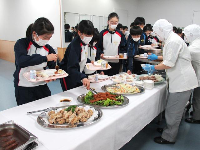 児童たちは、一つひとつを慎重にお皿に盛っていきます。豊富なメニューにたちまちお皿やトレイがいっぱいになり、それを持つ手も重そうです。また、マスク姿ではありますが、それぞれの様子を伺うと、皆とても真剣な表情です。選ぶメニューは決まってはいるのですが、一つずつを自分で取っていくという形式が彼らをそうさせるのでしょう。これもまた日頃の給食とは違う風景です。ただし、酢の物と野菜サラダ、おでんの大根とごぼう天などが残り気味だったのが少し気になりました。