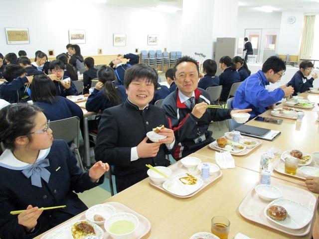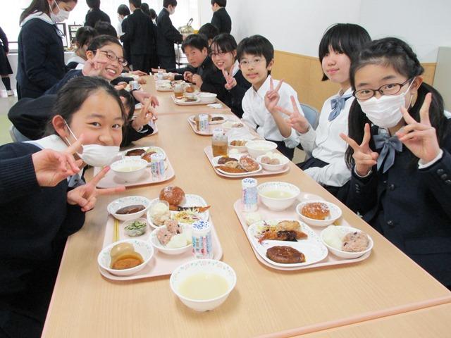 楽しい食事会はあっという間に終わりましたが、M2生たちは笑顔いっぱい、お腹いっぱいの表情でした。児童たちに少しでも喜んでもらおうと工夫してくださった給食業者の皆さんに御礼申し上げます。「ごちそうさまでした!」