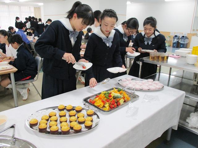 食事が始まると、どのテーブルも楽しそうです。大いに食べる者、一つひとつをゆっくりと味わって食べる者、会話に花を咲かせる者、残ったメニューを狙う者など、ウキウキした気分が漂っています。どの料理もおいしいようで、味の点でも満足の行くもののようです。そして、料理を食べ終えた頃を見計らって、デザートが登場しました。マフィン・ミニババロア・フルーツとこれもまた豪華なメニューです。男子も女子もさっそく列を作ります。「イチゴばかり取っちゃダメ! 残しといてや」と後ろから厳しい声もかかります。あれだけのメニューを平らげたはずなのに、やはり”別腹”なのでしょうか。しっかりと皆のお腹におさまりました。