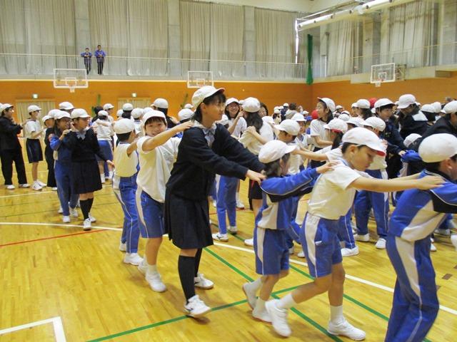 続いて、企画委員たちが考えたこの日のための「全体遊び」が行われました。最初は「じゃんけん列車」。異学年同士がじゃんけんをして、負けた方が白帽子になって相手の後ろに回ります。それが繰り返されるたびに、小学校の全学年の児童たちが連なっていき、体育館いっぱいに動き回ります。どの顔も笑顔です。特に大きなお兄さんお姉さんと一緒に遊ぶことを楽しみにしている低学年の子どもたちの嬉しそうな表情が印象的でした。