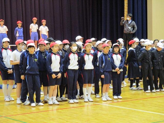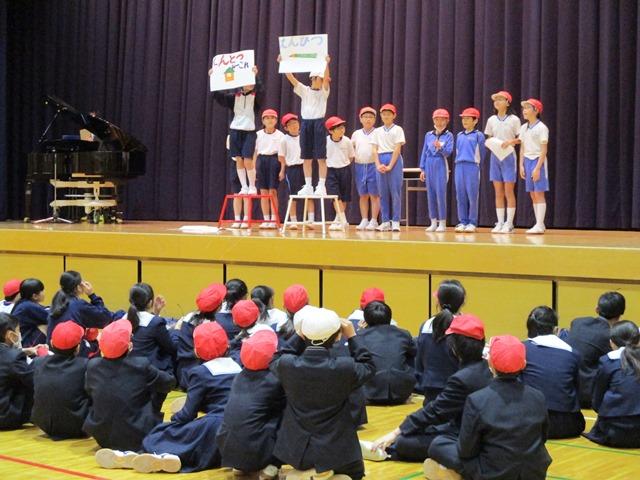 「全体遊び」第2弾は、「ステレオゲーム」。壇上の企画委員が一つの単語の一文字ずつを一斉に叫びます。そして、「”サンゴ”と”ビンゴ”、今叫んだのはどっちの単語?」と質問が出ます。その答えをみんなは赤白帽で示します。少しややこしいので、楽しめるかなと心配をしたのですが、児童たちはここでも一生懸命にゲームに取り組んでいました。本校の児童たちの積極性や素直さを見ることができました。このゲームの最後の単語は”おめでとう”か”ありがとう”という問題。なるほど、企画委員たちはこの言葉を言いたかったんだなと分かり、彼らのアイデアに感心させられました。