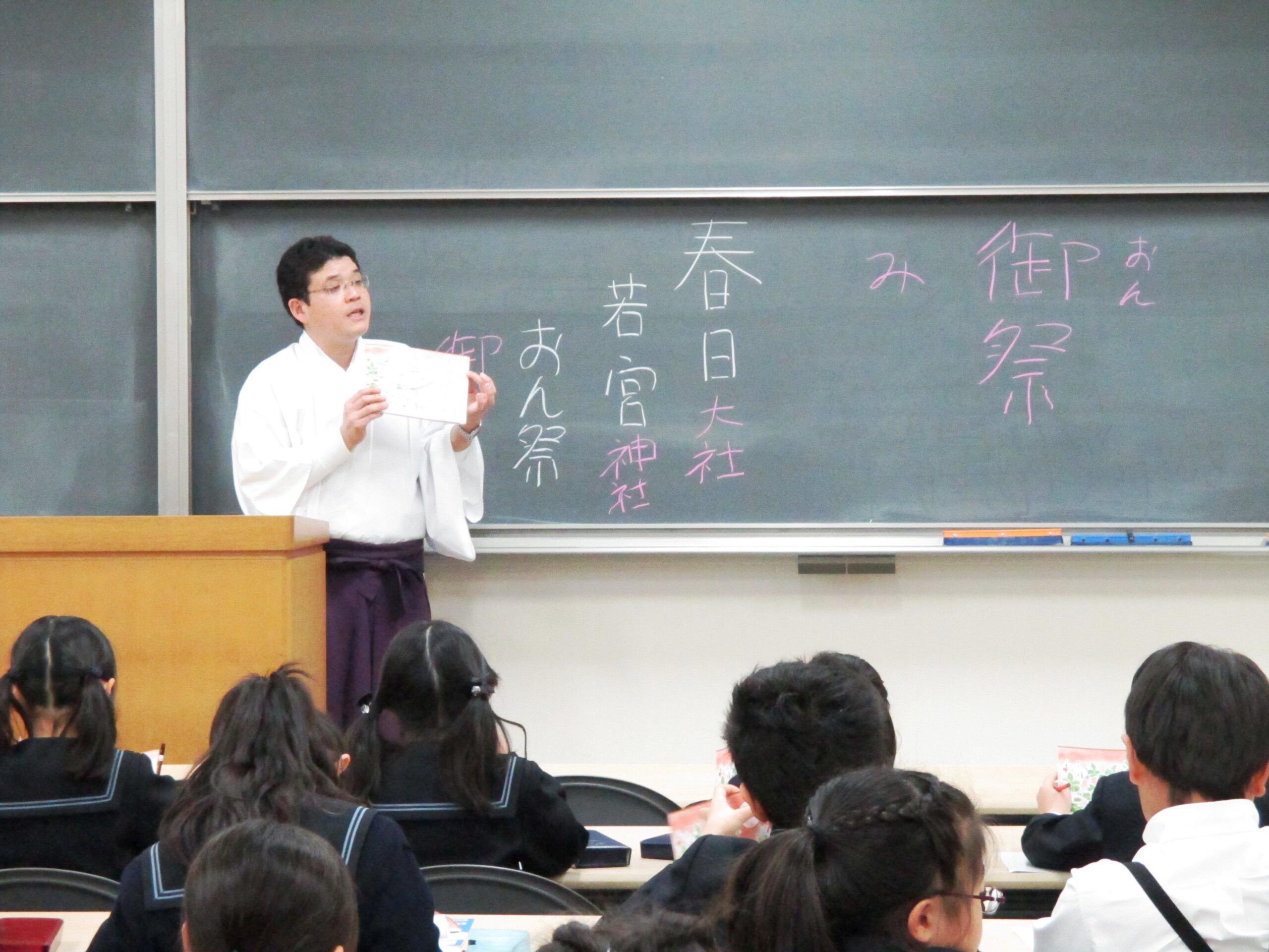 3月6日(月)、春日大社権禰宜の荒井清志さんに来校いただき、P3(小3)生が、国指定重要無形民俗文化財である「春日若宮おん祭」についての講話を伺いました。