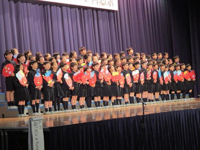 2番目はP2(小2)の「鍵盤ハーモニカ奏と歌唱」です。鍵盤ハーモニカによる「ハイホー!」と「夢をかなえてドラえもん」の2曲は、予行の時に比べてさらに上手になっていました。テンポとリズムがよく揃っており、隊形や動きに力強さが感じられ、彼らの成長を実感しました。胸を張っての堂々とした態度も好感を持てました。