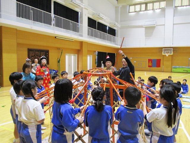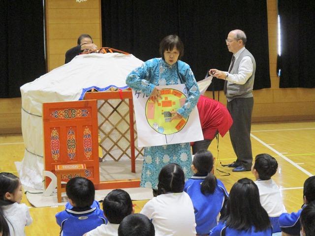 1月28日(土)、P2(小2)生が、恒例の「モンゴル体験」を実施しました。この活動は、国語の授業で学ぶ『スーホの白い馬』という物語の内容をより深く理解するために、モンゴルという国や人々のこと、そこでの暮らしや文化について学び、体験しようというものです。そのためにお越しいただいたのは、モンゴルパートナーシップ研究所(京都府長岡京市)の方々です。