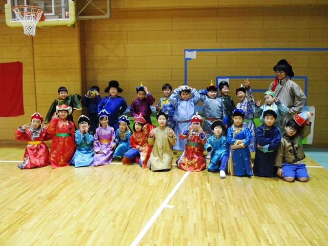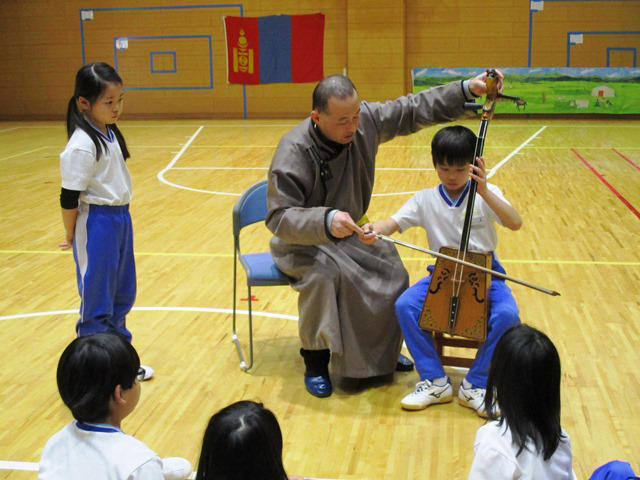 最後は、モンゴルの民族衣装デールの試着、ゲル内部の見学、馬頭琴の演奏を体験させていただきました。みんな興味津々、ゲルの中がとても広いことに驚いたり、デールを着てポーズを決めたり、馬頭琴の響きを身体で感じたりして、モンゴルの伝統をしっかりと体験しました。『スーホの白い馬』の世界にぐっと近づき、これからの学習に大いに役立ったと思います。