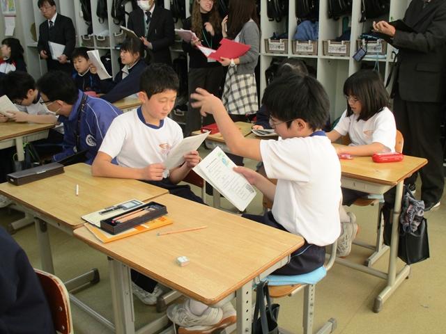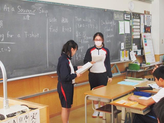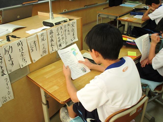 その後は、発音及び会話の練習です。先生の範読に続いて、斉読やグループ読み、ペアでの読みが繰り返されます。ジェスチャーを交える児童も現れてきました。授業の最後には、代表者が皆の前で会話を行います。さすがに手を挙げて出て来ただけあって、代表者のやり取りや発音はなかなかのものでした。全体としては、肝心の会話の部分でもっと活気が欲しいと思いましたが、徐々に近づいてくるハワイ宿泊学習に備えて、児童たち一人ひとりの気分が少しずつ高まって来たように感じました。