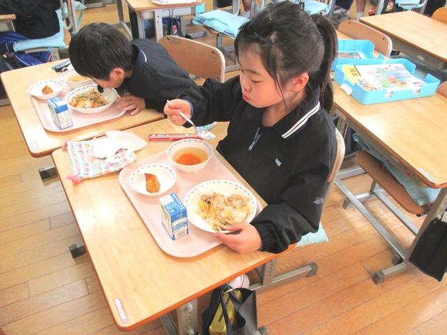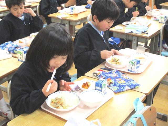 1月26日(木)にはP1教室を訪れました。メニューは、「深川丼(東京都)」に、中華風ポテト・のっぺい汁。担任の先生からは、「今日は深川丼という東京都の郷土料理です。東京が昔江戸と言っていた時に、深川という地区は海で、アサリがたくさん取れました。そのアサリを使った料理ですよ」という説明があり、それを聞いて初めて、ごはんにかけた具の中にアサリが入っていると知った子も多いようです。野菜が多いので、中華丼と思っていた子もいました。でも、食べてみるとお肉とは違った食感のアサリを気に入ったようで、それを選んで食べている子もいました。ただ、みんなが気になっていたのは、深川丼よりも中華風ポテトです。飴の絡んだお芋がおいしいようで、最後まで大切にとっておき、ゆっくり味わっている姿が印象的でした。ちなみに、「のっぺい汁」も新潟県の郷土料理で、サトイモ・ニンジン・ゴボウ・レンコンなどの野菜が入った汁物です。P1生もこの1年でよく成長し、野菜もしっかり食べられるようになってきました。