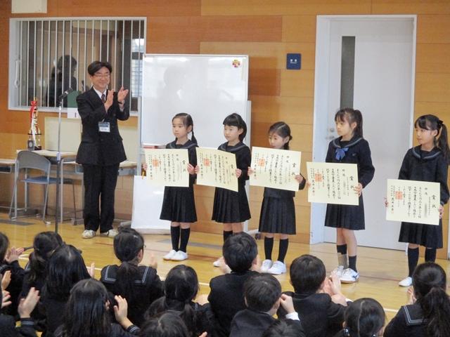 式辞後には、「日本学書展」特選受賞者と全国小・中学校作文コンクール奈良県審査の受賞者への賞状授与を行いました。小学校低学年の部で最優秀賞を受賞したP3の中嶋君には、受賞作品をみんなの前で読んでもらいました。題名は「五十メートルの愛情」。夏休みのある日、いつものようにおばあちゃんたちの家から帰る時に、自分の家に入る直前に振り返ると、50m離れた玄関先で、おばあちゃんがずっと見守ってくれており、その50mという距離が、おばあちゃんの愛情で満たされているような幸せを感じたという内容の作文でした。児童たちは、誰もが心当たりのある体験であるのか、真剣に中嶋君の朗読を聞いていました。