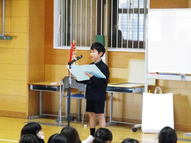 私からの式辞は、「7月最初のP朝礼時にA先生がおっしゃっていた話を覚えていますか?」という問いかけで始めてみました。最初に手を挙げてくれた児童は、「和菓子の話だった」と答えてくれ、私を驚かせました。よく覚えているなと感心したのです。その時のA先生の話は、「夏越の祓」や「水無月」という和菓子を話題にしたものでした。2学期の終わりにあたり、「年越の祓」や「年越しそば」の話を児童たちに紹介し、1年をしっかり締めくくってほしいという話をしたくて先の問いかけをしたのです。さらに続けて、「『一年の計は元旦にあり』という言葉があります。今年一年の目標や決意は元旦に決めるのが良いと言われています。その時には、”お・しょう・がつ”という文字にちなんで、「お:落ち着いて(行動する)」「しょう:正直に(話す)」「が:我慢強く、つ:続ける」という言葉を入れてみてください。」と話しました。この2学期の学校生活を通じて成長を見せた児童たちが、さらに心を磨く課題に取り組んでほしいと願って、このような話をさせてもらいました。
