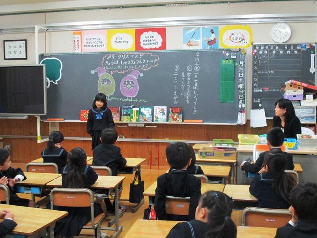 終業式の後には、各教室を見て回りました。2学期の通知表を渡されて、他の子には見えないようにしながらじーっとのぞき込む児童やニコニコした笑顔で他の子と比べ合う児童、一人ひとりが前に出て2学期に達成したことを発表し合うクラス、今夜のクリスマスイブを楽しみにして、一刻も早く帰ろうと片付けを急ぐ様子など、2学期終わりの子どもたちの様々な表情に出会いました。