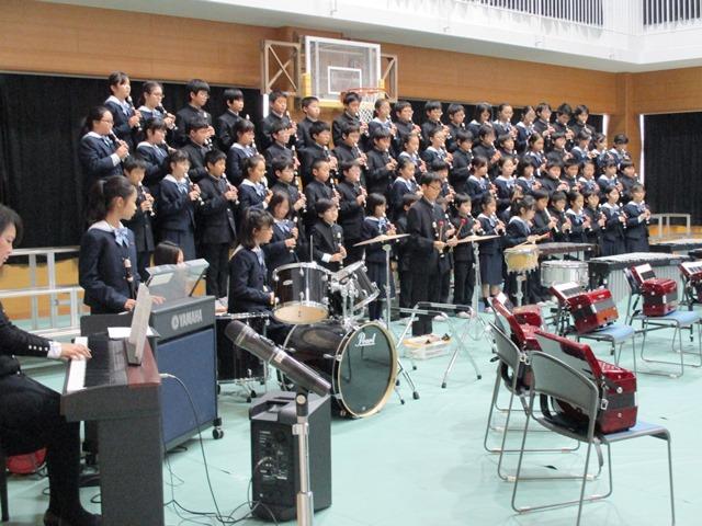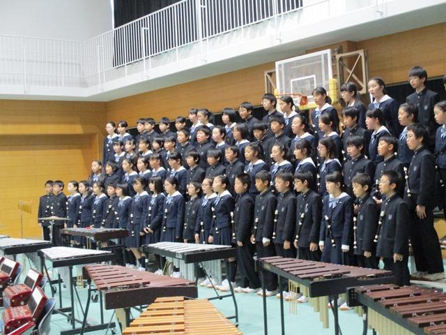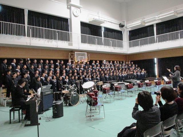 最後の合同合唱「群青 Azure」には感心というより、感動しました。この曲は、福島県南相馬市立小高中学校の平成24年度卒業生と音楽教諭によって作られた曲だそうで、「いつかこの海を越えて」と同じく、震災後の子どもたちや若者たちの思いが歌詞になっています。「あれから2年の日が僕らの中を過ぎて、3月の風に吹かれ、君を今でも想う」という歌詞を聴くだけでも泣けてくるのですが、いつも以上に精一杯大きな声で、しっかりとした発音で歌うM1・2生の姿に感動してしまったのです。最後の挨拶をうまく言えなかったことを申し訳なく思いますが、それだけ君たちの気持ちが私の胸に響いたことをここで告白します。ご来場の保護者の方々の胸にもきっと響いていたことだと思います。