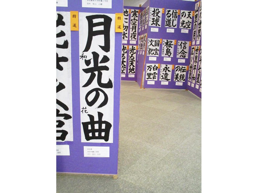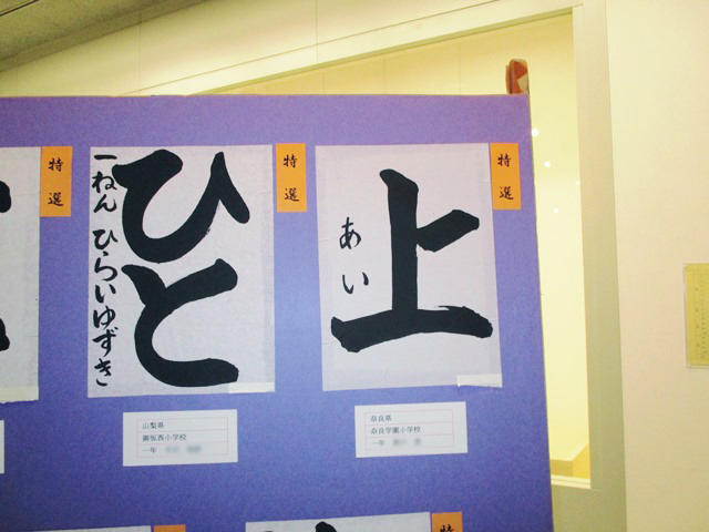 表彰式終了後、奈良市美術館(イトーヨーカドー奈良店5階)で開催されている学書展展覧会に足を運びました。特賞作品はガラスケースの中で展示されており、それらの見事な作品にまず圧倒されました。本校からは、特選のP1三輪有沙さん、奥内愛さん、庄司暖佳さん、P2奥葵さん、P4の飯田和花さん、M2大萩祐可さんをはじめ138名の準特選及び入選があり、特選作品はボードに貼られて展示されていました。あまりにたくさんの作品が展示されているために見つけるのに苦労しましたが、見つけた作品に向き合ってみると、どの作品もくっきりと太く、その児童の個性と気持ちが正直に表れているようでした。翌日21日(月)のP朝礼で、いただいた賞状とトロフィーを披露し、「全員の力で受賞したものです。これからも頑張ってください」と児童たちの活躍に敬意を表しました。