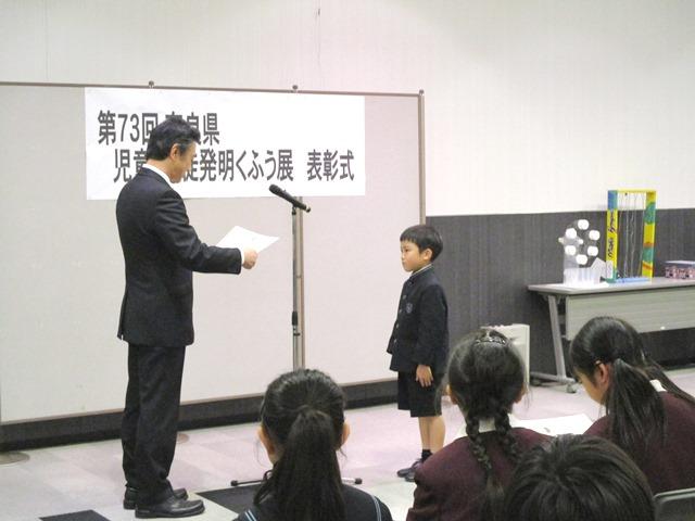 表彰式は、最高賞の「近畿経済産業局長賞」を獲得した本校P3(小3)の阿品さんから始まりました。続いて、同じ奈良県内の私立小学校である智辯学園奈良カレッジ小学部の2人に奈良県知事賞が贈られました。その後、本校の児童では、奈良県議会議長賞のP2若原君、奈良県教育委員会賞のP4木村君、奈良県発明協会会長賞のP4亀松君、日本弁理士会近畿支部長賞のP4加藤君とP4山中君、奈良県町村会長賞のP4坂本君とP4入江さん、奈良県市町村教育委員会連合会賞のP4奥内さんが順に表彰を受けました。