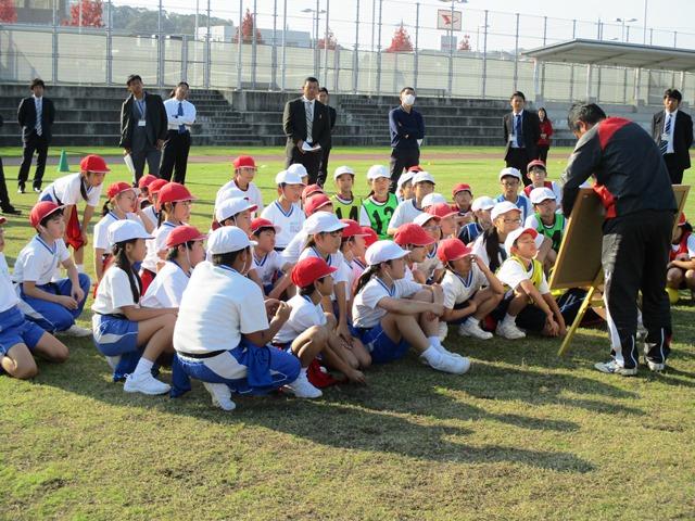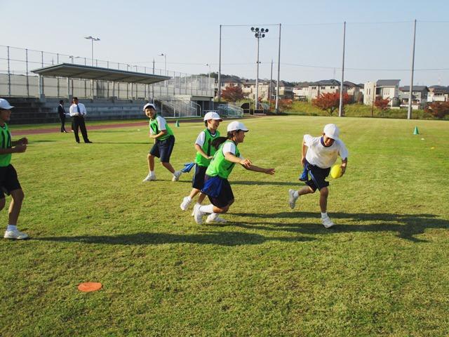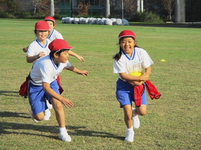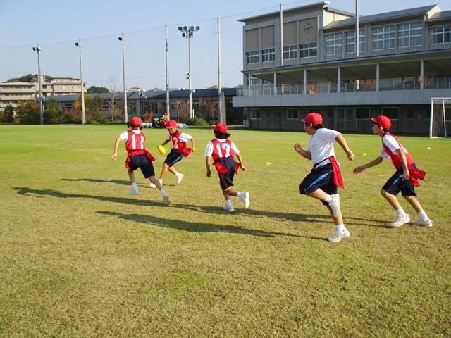 11月7日(月)、西日本私立小学校連合会の半日研修会があり、本校では保健体育部会の公開授業が行われました。参加した私立小学校の先生方に見ていただいたのは、異学年による合同授業で、P3B(小3)・M1C(小5)合同の「フラッグフットボール」に授業です。「フラッグフットボール」とは、アメリカンフットボールからタックルをなくしたスポーツだそうで、攻撃側はアメフトで使うようなボールを持って敵陣へのタッチダウンを狙います。一方、守備側はタックルをする代わりに相手の両腰につけたフラッグを奪うことで攻撃を阻止するというスポーツです。
