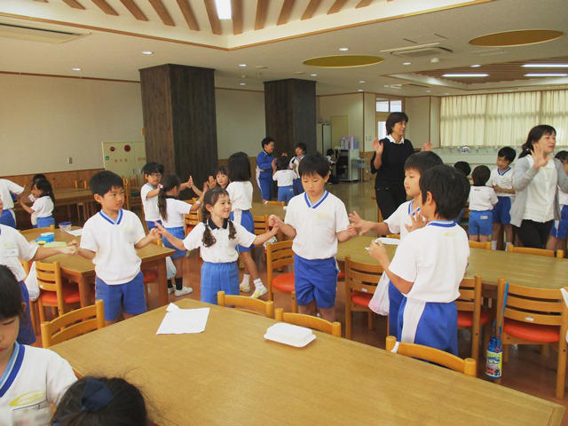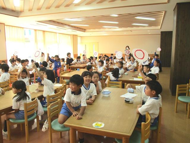 交流会ということで、次はP2生たちが考えてきた「さつまいも○×クイズ大会」が始まりました。「さつまいもの食べているところは根っこである」、「さつまいもは、じゃがいもと同じ仲間である」、「さつまいもの花は、あさがおの花に似ている」、「さつまいもは水の中で育つ」などの問題が、P2生各班から出題されます。各班のテーブルでは顔を寄せ合って相談しながら、○か×のウチワを高く掲げます。PP2の子どもたちには難問だったでしょうが、自主学習を通してさつまいものことをよく調べているP2生にとっては簡単な問題も多かったようで、正解を続ける姿が見られました。