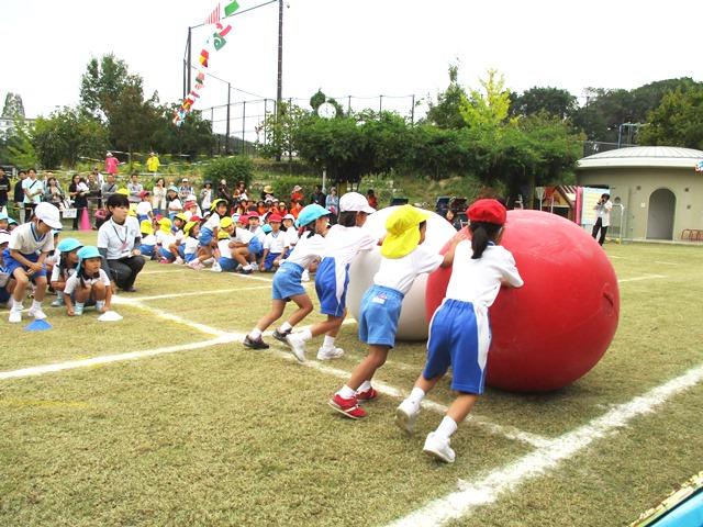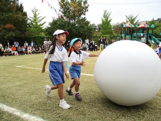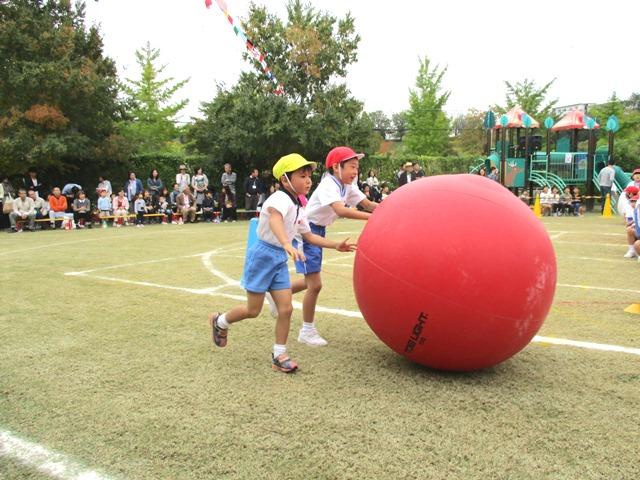 競技内容は「大玉ころがし」です。紅白に分かれて、年長児と協力しながら、大玉をころがしながらトラックを半周します。決して広くはないトラックなので、コースに沿ってころがしていくのはなかなか難しいようです。前に進もうとする力が強くて、コーナーを曲がる時は、見ている方がハラハラドキドキしました。でも、子どもたちの表情はみんな笑顔で、本当に楽しそうに大玉と格闘しています。P1生たちも大いに楽しみながら、ころがす・まがる・止めるのコントロール役をうまく果たしてくれていました。中には、PP3の子どものことを思いやって、無理せず競技を進める姿も見られました。