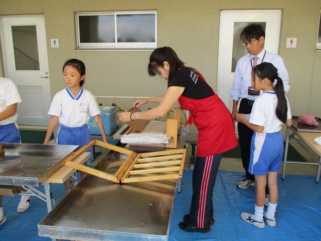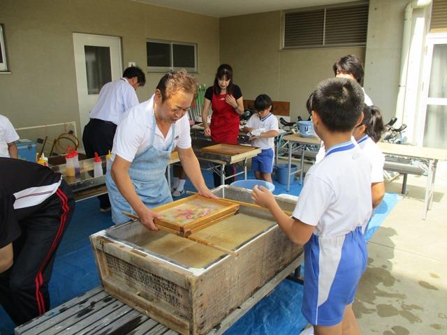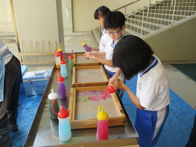 児童たちは、班ごとに、福西さんが用意してくれた楮(こうぞ)を入れた水槽に向かい、福西さんと一緒に簀(す)を挟んだ桁(けた)を持って、水槽の中の原料を掬い取ります。遠慮せずにたっぷりと掬い取り、簀にまんべんなく広がるように大きく揺すります。思っていたより力が必要です。そして、原料が全体に行き渡ったところで、ピタッと桁を平行にします。これをそっと次のテーブルに運び、そこで彩色をします。赤・青・黄・緑・紫などの色が用意され、子どもたちはここで自分だけの和紙に仕上げていきます。福西さんの奥様によれば、この彩色に使う液は草木染に使うものだそうで、自然の材料から作られているとのことでした。淡いきれいな色の液を使って、子どもたちは花や虹、様々な模様を描いて大いに楽しんでいました。