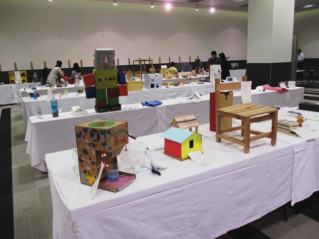 会場に到着すると、これらの受賞作品が一列に展示されていました。最高賞を獲得したP3阿品さんの「観覧貯金箱」の出品票には、「コインの種類ごとに分かれたゴンドラにお金を入れて、芯棒を矢印の方向に回すと、下の貯金コップに分かれて入るようにしました。それぞれのパーツを透明にして、どこにいくら入っているか、分かりやすくしました。お金を入れてゴンドラを回してもたおれないように、芯棒の長さでバランスを調整しました」と書かれていました。取り扱い方や工夫した点を上手にまとめていて、この出品票の説明にも感心しました。