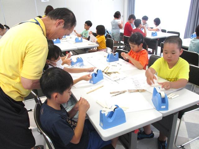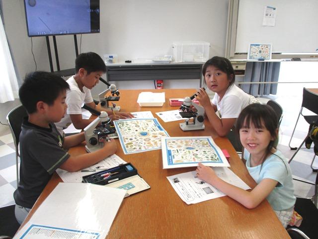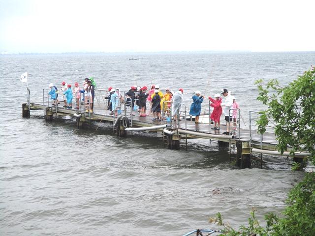 到着して、それぞれの活動の様子を見学しました。「生き物調べ」では、琵琶湖から採ってきたプランクトンや水草を、顕微鏡を使って観察していました。顕微鏡の調節に苦労しながらも、動いているプランクトンを発見しては「見て見て!」とはしゃいでいます。プランクトンを身近に感じるという貴重な体験ができたと思います。「ヨシ紙笛作り」では、ヨシ紙のパイプを組み合わせて笛を作っているところでした。見本を参考にしながら皆黙々と手を動かしていました。「生き物調べ」でも、「ヨシ紙笛作り」でも、何事も一生懸命に取り組むのが本校の児童たち、ということを改めて感じました。ただし、せっかく校長先生がやって来たのに、あまり喜びを見せてもらえなかったのは、ちょっと残念でした。一方、「外来魚調べ」のために桟橋からの釣りを行っていたグループは、合羽を着て、小雨交じりの風の中で活動中。でも、何とか一匹でも釣ってやろうという気持ちが強かったようで、ここでも皆夢中になって挑んでいました。活動終了後には閉講式があり、2日間お世話になったスタッフの方々に皆でお礼の言葉を述べました。