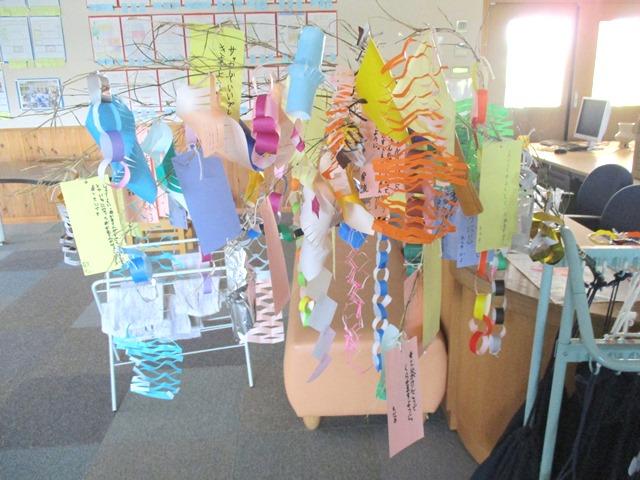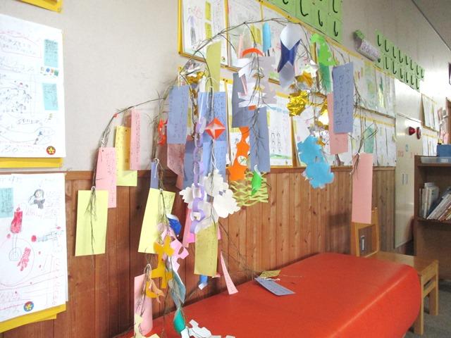 7月7日(木)、七夕の日。子どもたちが帰った後の教室を見て回りました。それぞれの教室の前には、子どもたちの願いごとが書かれた短冊が吊るされた笹が飾ってあります。とは言っても、この暑さで、1週間前にいただいてきた笹の葉は丸まって細くなっています。ちょっと残念でしたが、輪っか飾りや網飾りの間にある子どもたちの願いごとをゆっくりと読ませてもらうことにしました。