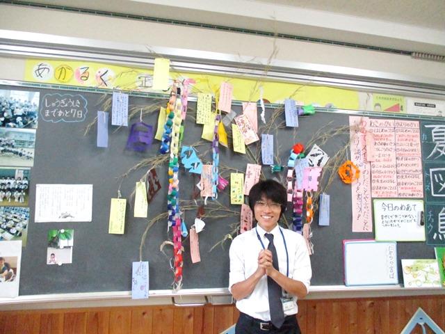 P2(小2)の教室に行くと、担任の先生が作業をしていました。教室の黒板に上手に笹が飾られていたので、その前でポーズをとってもらいました。ここでの子どもたちの願いごとには、「うれしいことがいっぱいおこり、いやなことがありませんように」「だれもけんかしませんように」「おにいちゃんがしかられませんように」など、自分の周りの”平和”を願う言葉がありました。優しい気持ちの子どもたちが多いなと感心しました。