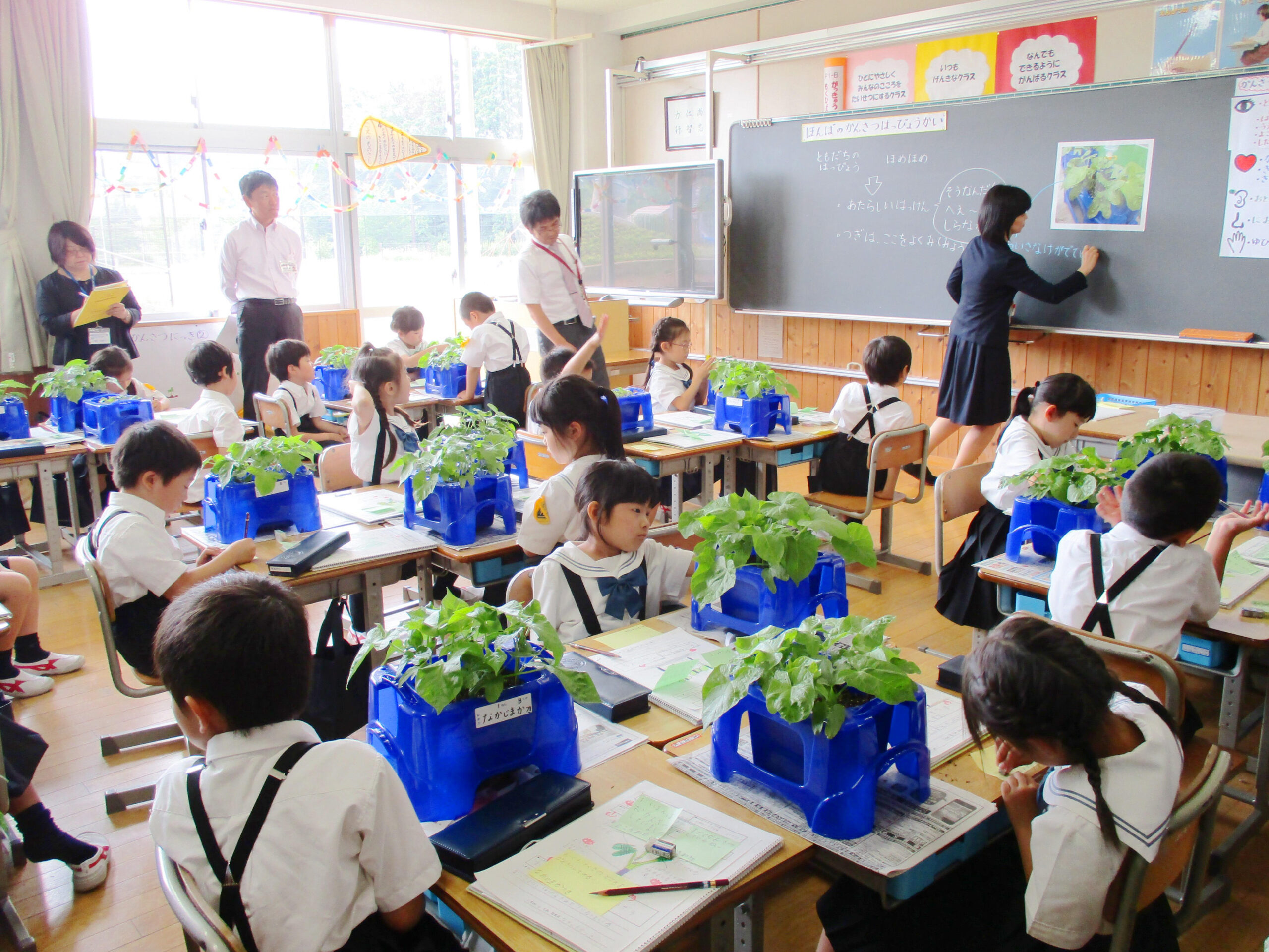まず、全学年・全クラスでの公開授業がありました。P1(小1)は国語・生活総合、P2(小2)は英語・算数、P3(小3)は算数・体育・理科、P4(小4)は国語・音楽・社会・M1(小5)は算数・理科・国語、M2は図工・社会・家庭の授業を公開しました。担当する教員は皆緊張の連続だったようですが、子どもたちの素直で積極的な態度に助けられて、上手く進めることができたようです。P4の国語は「新聞を作ろう」というテーマで、奈良新聞社の方にもお越しいただいて、見出しを考える授業に取り組みました。同じくP4の社会は「奈良県のくらし」というテーマで、吉野町から福西さんと奥谷さんをゲストティーチャーにお招きして、県の伝統産業である和紙作りについて学びました。