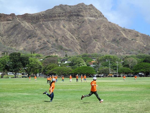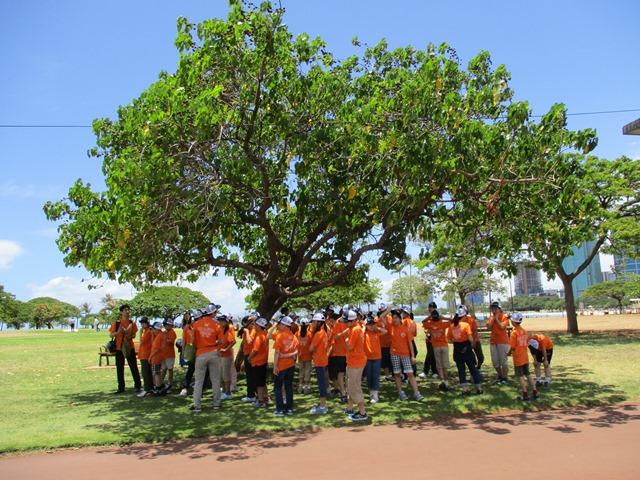 ハワイと日本の時差は17時間。到着した時の現地は、5月17日(火)の午前11時。日付変更線を越えたので、昨日の午前中に戻ってしまったということになります。天気はもちろん晴れ。日本の夏のジリジリとした暑さではありませんが、やはり暑い。それに風が強く吹いています。今年は例年以上の風の強さだそうです。長時間のフライトに、時差、そしてこの環境の変化にM2生たちは何とか慣れていこうとよく対応してくれています。事前の学習が功を奏しているようです。バスで移動し、カカアコウォーターフロントパークへ。ここではワイキキ水族館見学と、ダイヤモンドヘッドをバックに記念写真を撮りました。身体を動かせる機会ができて、児童たちは楽しそうに動き回っていました。おにぎりの昼食も食べて、元気が出てきたようです。さすがに若い。同行する私の方が早くも疲れ気味です。