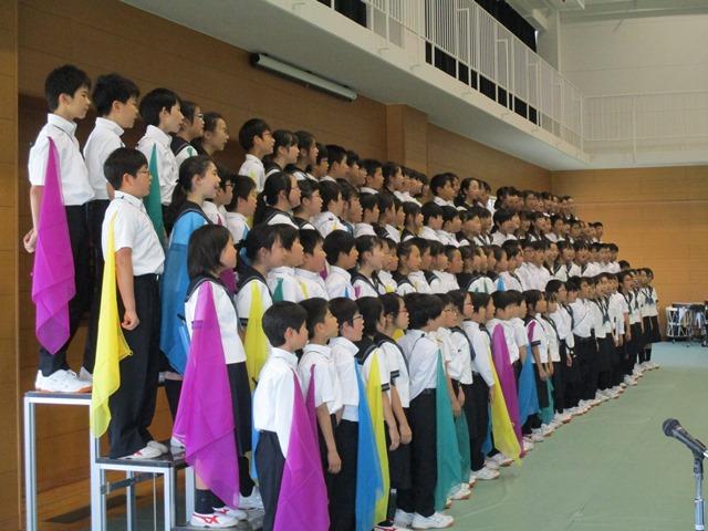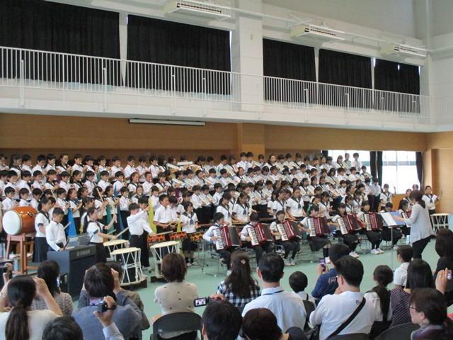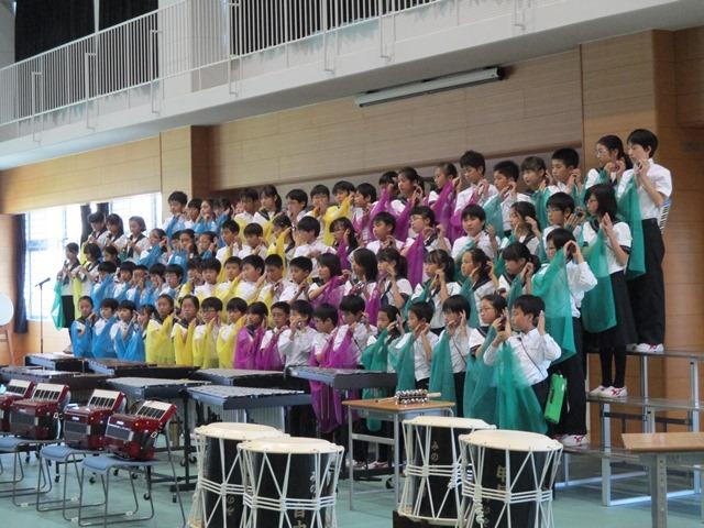 最後の曲は、合同合唱「地球星歌」です。児童たちからのメッセージの後、曲が始まります。さすがにM1・2生だけあってきれいな歌声です。ハーモニーもうまく響いています。2つの学年が上手に溶け合って歌っているところに感動を覚えました。