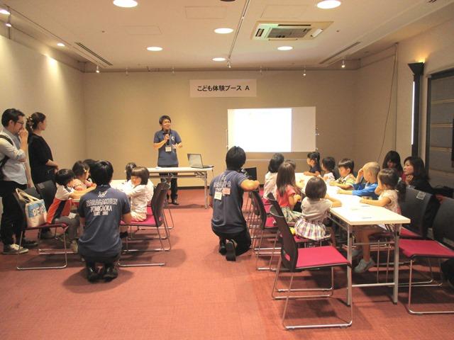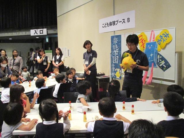 このイベントの目玉は、「子ども体験ブース」。各校の先生方がその学校の良いところを知っていただこうと、いろいろな工夫を重ねて、子どもたちに小学校での授業を体験してもらおうという取り組みです。英語ではネイティブの先生と一緒に歌やゲームをしたり、図工では紙コップロケットやジャンプ人形を作ったり、その他に音楽や算数を体験したりするものもありました。本校からは、日比先生による「数カルタであそぼう」と福呂先生による「わくわく理科じっけん」の2つのプログラムを用意しました。