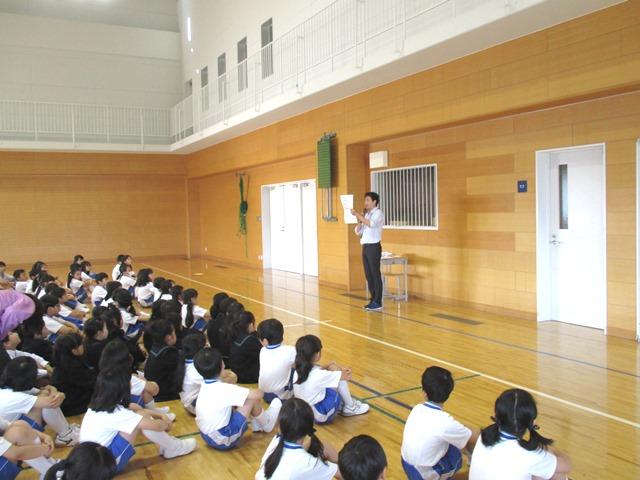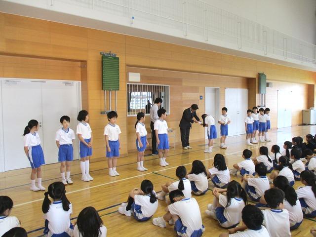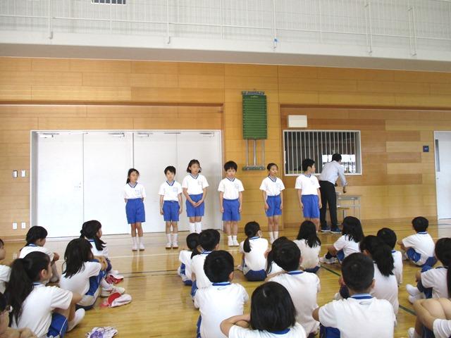 Y先生からの話の後、P3・4各クラスの1学期学級代表認定式がありました。P3Aは、市川君と今西さん、P3Bは中嶋君と田中さん、P3Cは川口君と永田さん、P4Aは木村君と中島さん、P4Bは半田君と湊さん、P4Cは坂口君と吉田さんがそれぞれ選ばれ、私から認定書を渡しました。それぞれの学級代表には自覚と責任感を、また選んだクラスの皆さんには代表に協力して一緒になってクラスを運営していく姿勢を持ってほしいと思います。「継続は力なり」です。