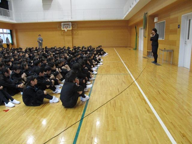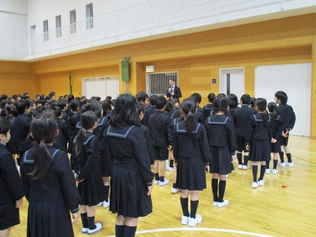 私の話に続いて、離任者及び着任者の紹介を行いました。6年間お勤めいただいた図工の島田先生からは、「みんなと一緒に図工をするのがとっても楽しみでした。図工の時間に発揮したいろいろな発想を大切にしてください」と離任の挨拶がありました。また、理科の浅田先生、英語のフォーブス先生からは、「一緒に楽しく勉強をしましょう」と日本語および英語で挨拶がありました。