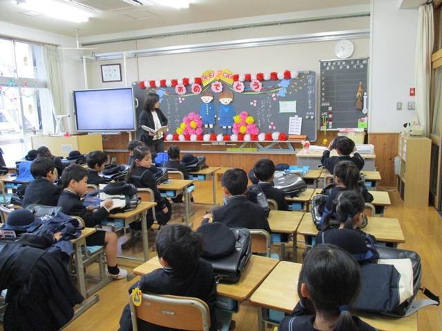 式辞では、児童たちにぜひ知ってもらいたいという思いから、本校の校歌の作詞者である冨士森和代さんが4月4日にお亡くなりになったことを伝えさせてもらいました。冨士森さんは、ご自身の歌詞が本校の校歌に採用されたことで、本校のことを本当に愛してくださり、合同運動会や尚志祭などの行事の時にはよく出席してくださいました。そして、子どもたちが校歌を歌うのを聞いて、とても嬉しそうな顔をしてくださっていました。Primaryでは1番の歌詞を歌うことになっています。「緑さやけき学研の この地に集う志」で始まる歌詞の意味を説明すると共に、3月のP修了式でも紹介した「高きアンテナ」や「大和金鵄」について話しました。そして、私の話の最後に、この日告別式が行われる冨士森さんのご冥福を祈って、子どもたちと共に黙祷を捧げさせていただきました。