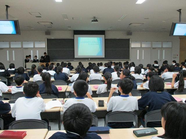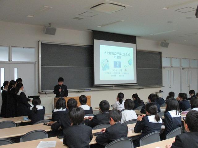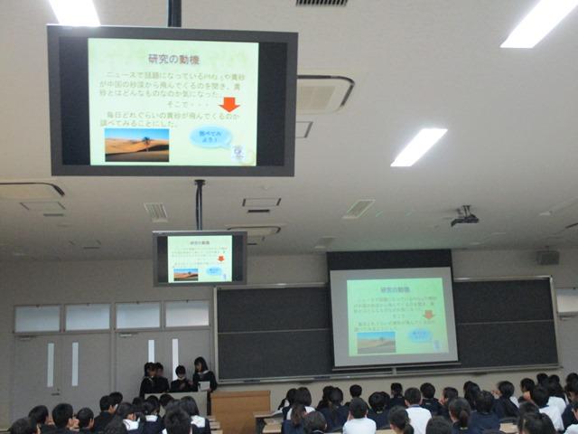 選抜された各グループの発表テーマは、「レジ袋を燃やした時に出るO2とCO2の割合」、「カビの培養」、「人と植物の呼吸と光合成の関係」、「海面上昇の要因は何か」、「土とコンクリートによる気温上昇~ヒートアイランド現象~」、「今、黄砂はどれくらいの量が振っているか」の6作品。いずれも「環境」を主題とし、その問題点に迫る力作が順に発表されました。