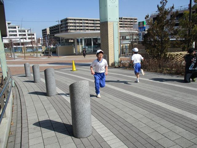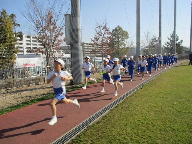 最初に登場したのはP4(小4)生。総合グラウンドのタータントラックを出発し、プロムナードを端から端まで走るコースを2周、約2.1kmの距離です。さすがは4回目となるP4生、各自自分の力を自覚しているようで、スタート時の無茶な飛び出しはありません。試走でのタイムを考慮した並びになっているので、前から順に軽やかにタータンを走り始めます。