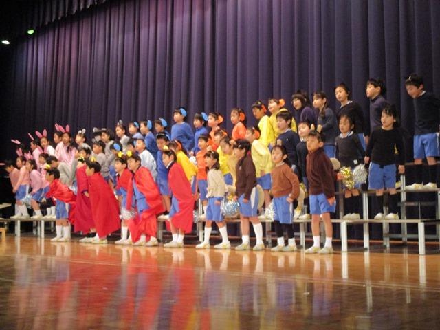 P1生は、劇『うたのきらいな王さま』。”なるほど、あの赤いマントを着ていた子どもたちが王さま役だったのか”とやっと納得しました。歌の嫌いな王様に、何とか歌の良さを伝えようとする動物たち。”ニコニコ歌うと楽しいよ、みんなで歌うと楽しいよ”とあの手この手で王様にアピールします。”でもな~、でもな~”と歌うことに臆病な王様の様子がなかなかいい雰囲気です。初めての舞台に、元気いっぱいで臨むP1生の姿をご期待ください。