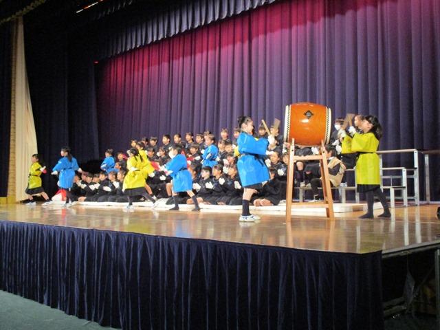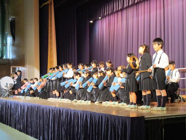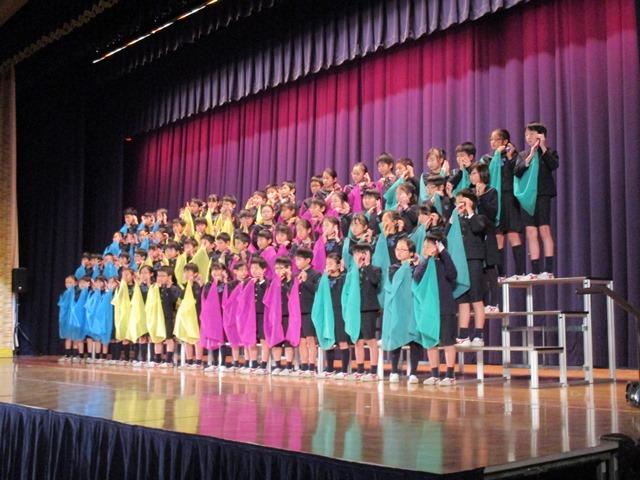 P2生は、とみっこ音楽祭『鍵盤ハーモニカ奏と歌』。幕開けの鍵盤ハーモニカ隊の入場がなかなかステキです。続く、「踊るポンポコリン」の合奏では、パーカッションと振付けが見ものです。”曲の楽しさに比べると、まだ皆の表情が硬いかなあ”という感じがしましたが、”曲を覚え、振付けも覚えるのは大変だっただろうな”と、練習の成果に感心しました。男子のネクタイ姿、女子のリボン姿と、凝ったステージ衣装にもご注目ください。