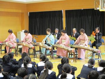 1月25日(月)、M1生(小5)が和楽器演奏を鑑賞し、各楽器の演奏体験を行いました。これは、奈良学園大学で音楽科教育を指導しておられる瀧明先生のご紹介により実現したもので、生田流筑紫会 箏曲・三絃教授飛梅司大師範・篠原歌鶯先生をはじめ鶯美会の皆さまにお越しいただきました。